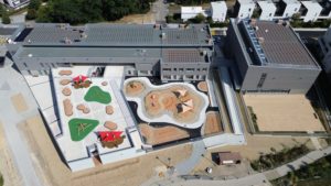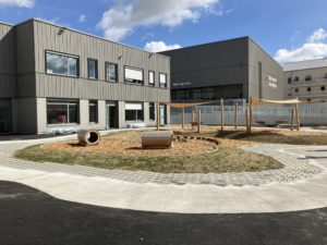 Les espaces extérieurs sont végétalisés avec des massifs colorés, des haies occultantes et des hôtels à insectes. Les cours de récréation ont été pensées pour permettre aux enfants de jouer ensemble, en limitant la division filles/garçons.