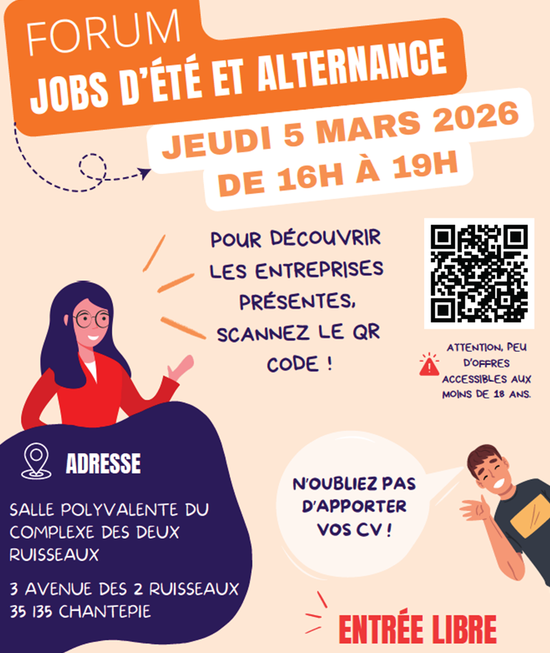 Le Forum jobs d’été et alternances revient le jeudi 5 mars 2026 de 16h à 19h. Il aura lieu cette année au complexe des Deux-Ruisseaux de Chantepie. Venez rencontrer des entreprises et prendre connaissance d’offres pour des jobs d’été ou des alternances. N’oubliez pas d’apporter vos CV !