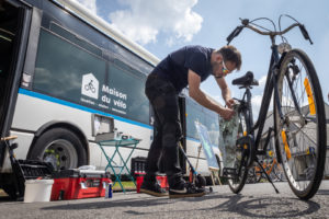 La Maison du vélo mobile, c’est les principaux services de la Maison du vélo de Rennes dans un bus-atelier qui se déplace dans votre commune ! Elle propose de nombreux services destinés aux cyclistes rennais, métropolitains ou de passage dans la métropole. Entretien, réparation, location, démonstration ou simple info… tous les vélos STAR sont concernés :