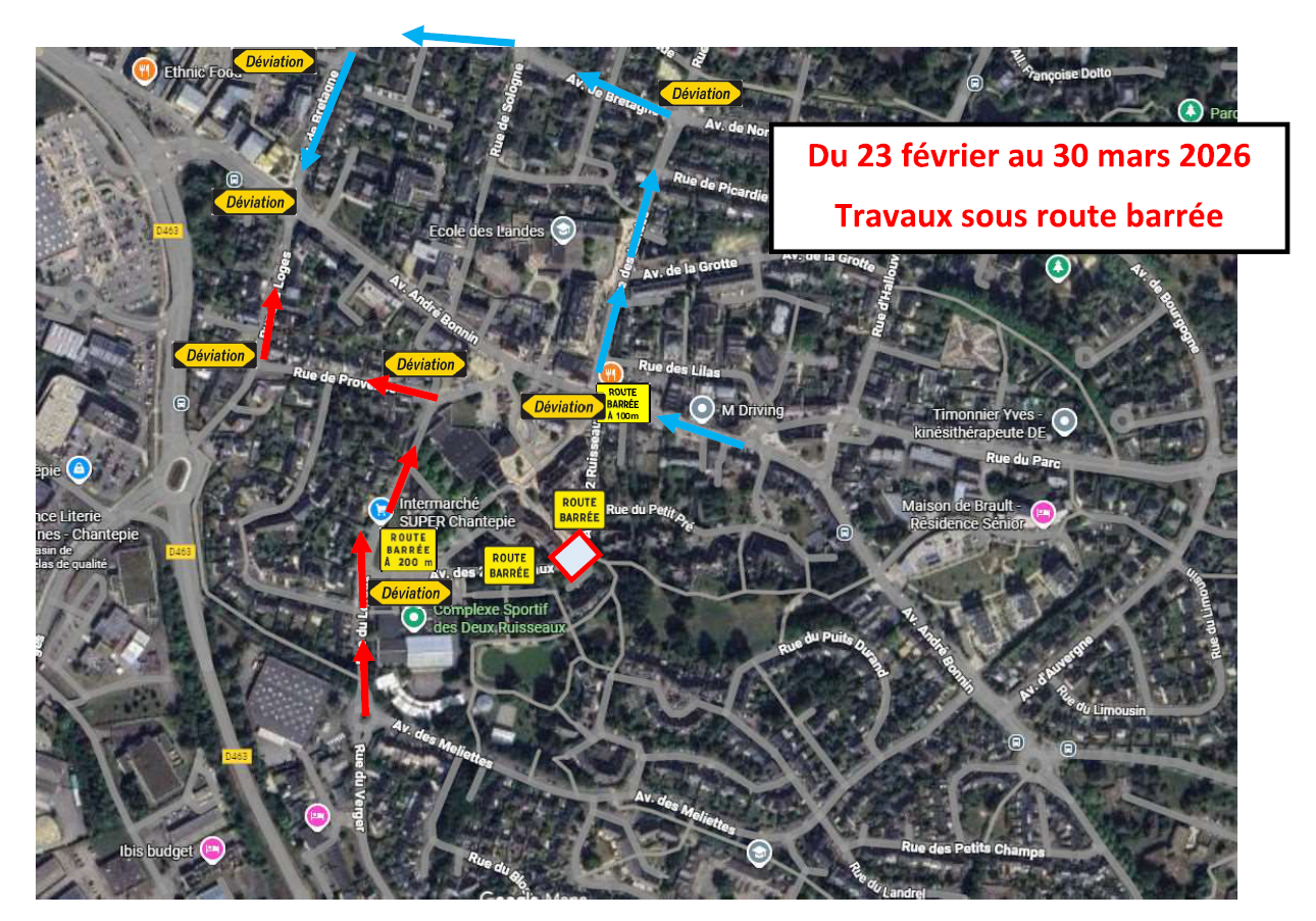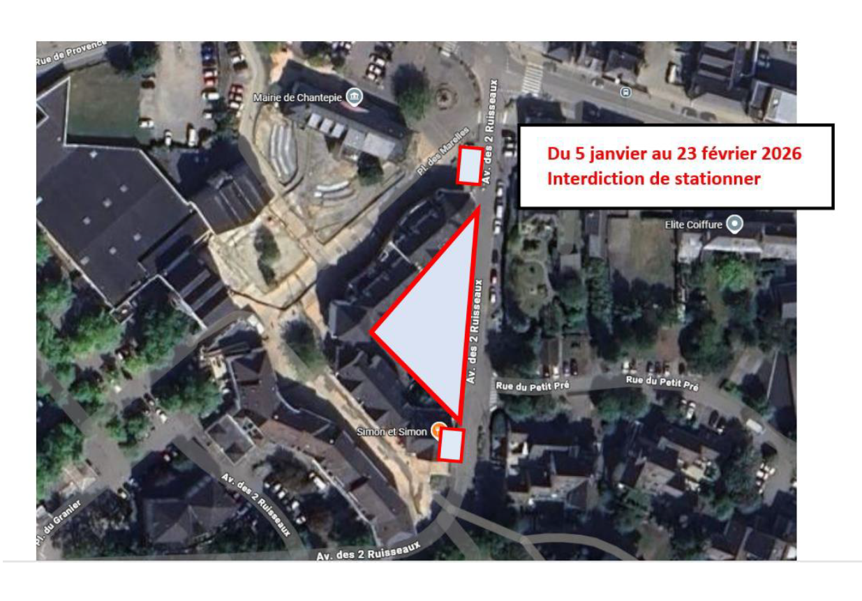 Dans le cadre des travaux de réaménagement de la place des Marelles, l’entreprise BARTHELEMY intervient avenue des Deux-Ruisseaux, dans la section comprise entre la rue du Petit Pré et le n°7 du 23 février au 30 mars 2026.